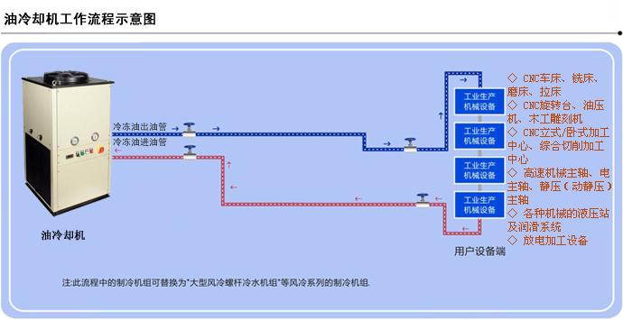 二、油冷機分類: 1、帶油箱式油冷機,油冷機組內(nèi)部配有油箱和油泵,在油冷機工作前必須要先把油箱注滿冷卻油,加入油箱的油由客戶選定,主要還是看客戶的設(shè)備所需要用什么品質(zhì)和標(biāo)號的油,一般為冷卻液,主要給加工中心主軸冷卻機。