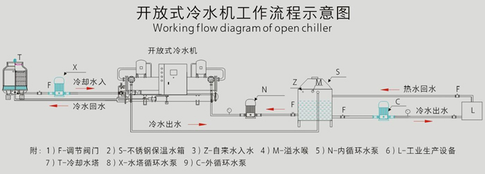 3、開放式冷水機(jī)組跟水冷式冷水機(jī)組結(jié)構(gòu)運(yùn)行原理一樣,開放式需要配置一臺循環(huán)儲水箱和外循環(huán)水泵;