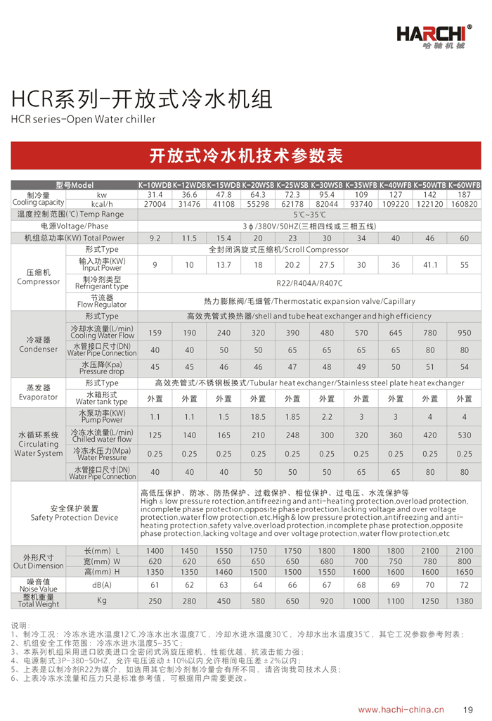 6、為保證使用安全,機(jī)組內(nèi)置漏電保護(hù)器、相位保護(hù)、過載保護(hù)、電流保護(hù);系統(tǒng)安裝了高、低壓保護(hù)傳感器,為防止缺水或循環(huán)水系統(tǒng)內(nèi)部結(jié)冰,機(jī)組安裝了流量開關(guān)和低液位保護(hù)裝置。